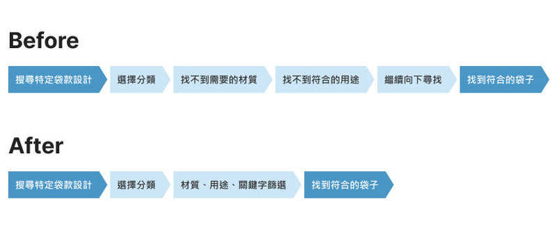為解決產品種類多、差異細的痛點,我們導入多條件篩選與即時搜尋功能,並在分類按鈕中加入袋型圖示作為輔助辨識,即使是對於環保袋款式毫無概念的消費者,也可根據圖像快速理解袋型差異。